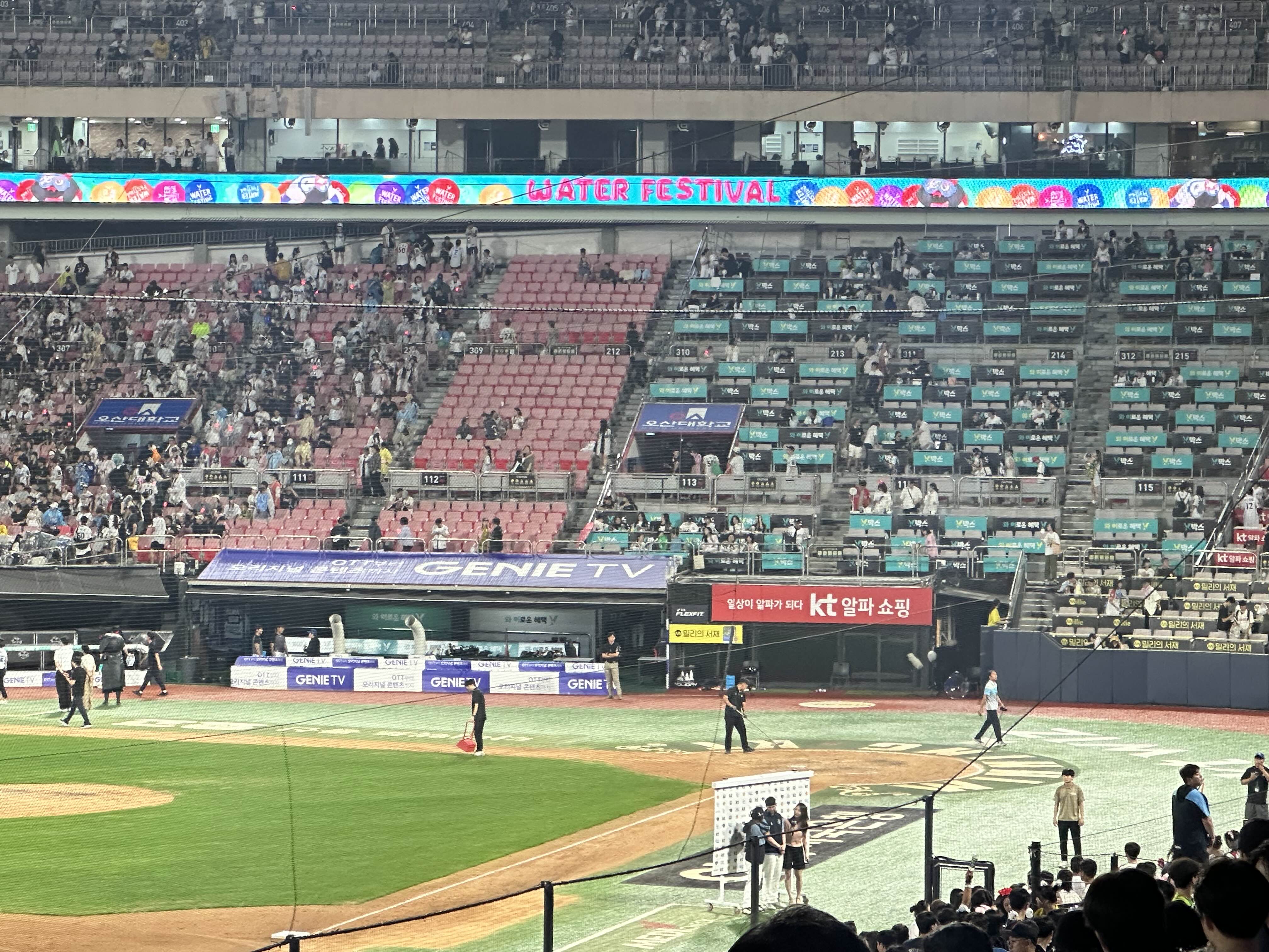 이날 워터페스티벌이라서 1루쪽에는 물대포가 계속 쏴졌는데요
