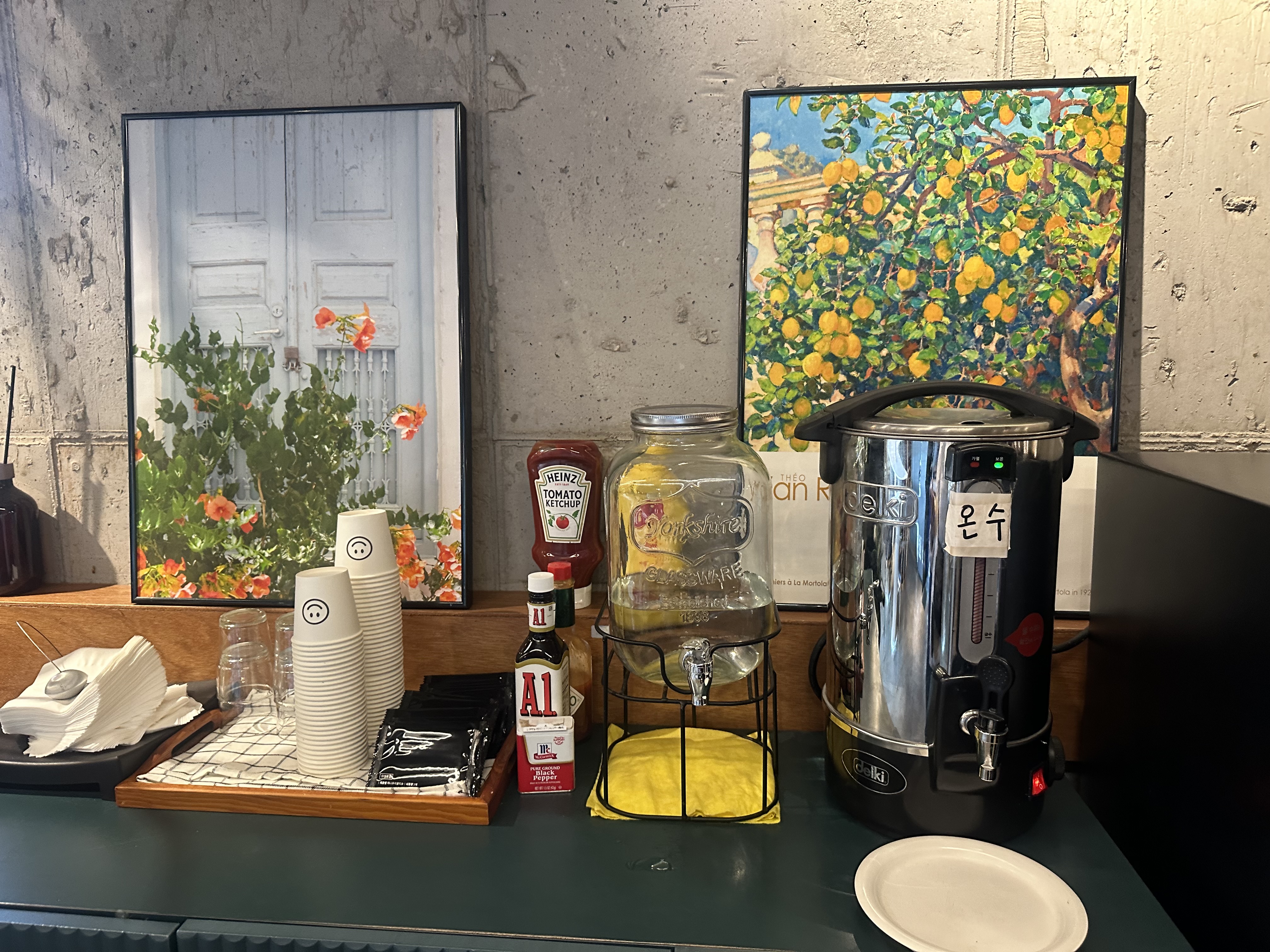 각종 소스류나 물, 온수까지 이곳에서 다 가져가실 수 있어요